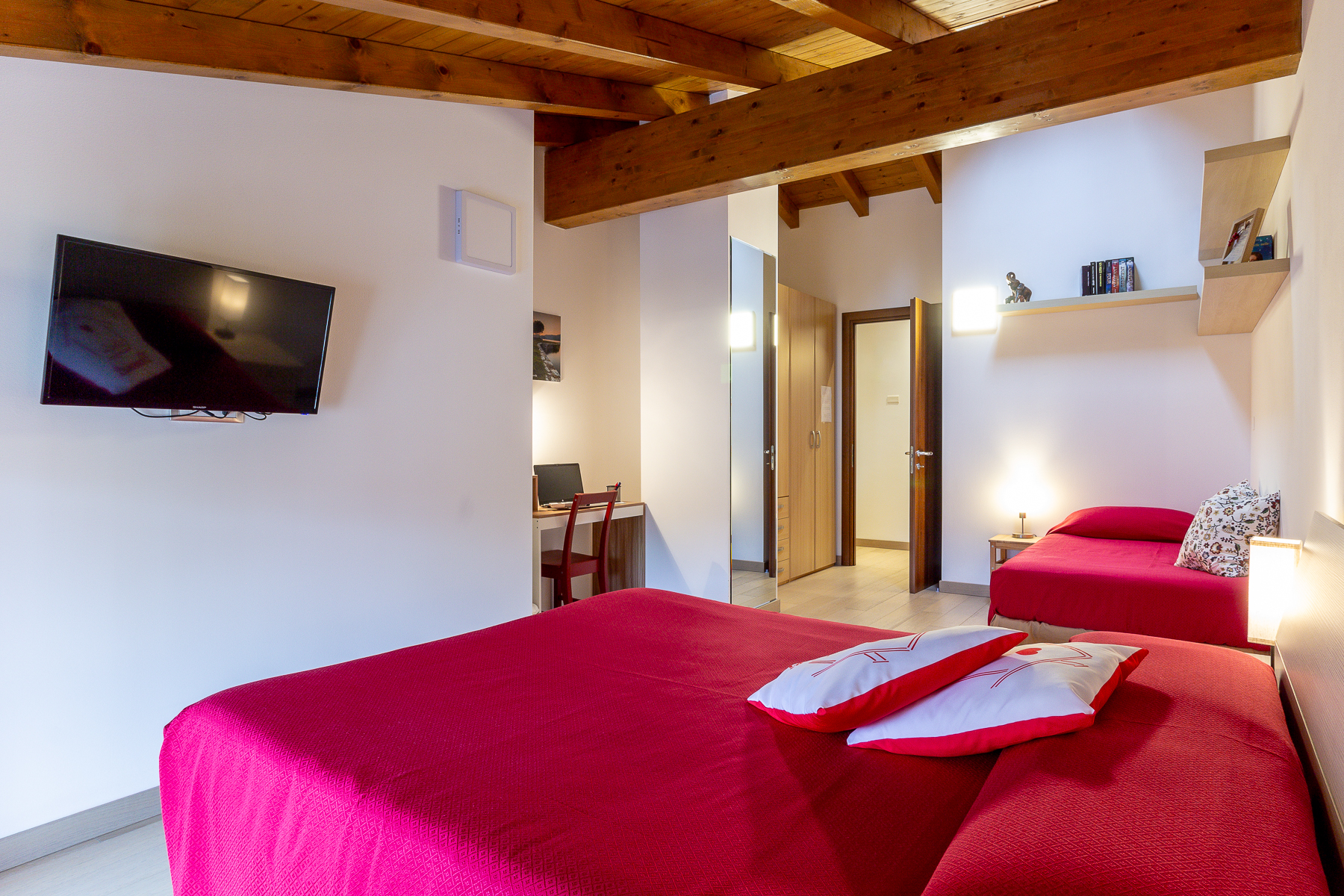 Un grazioso bilocale (55mq), situato al primo piano di una villetta a schiera (senza ascensore), mansardato e con il parquet in tutti i locali. Una spaziosa cucina, dotata di ampia finestra e una grande camera matrimoniale con aria condizionata, completa di terzo letto e scrivania, ottima anche per modalità di lavoro in smart working.