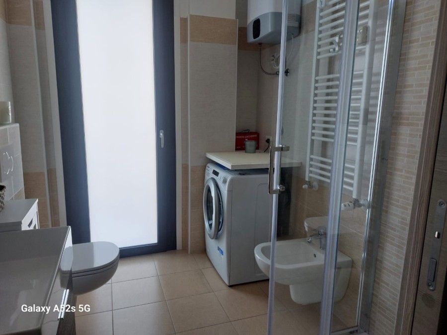 Bagno con doccia, lavatrice, asciugacapelli e balconcino di servizio.